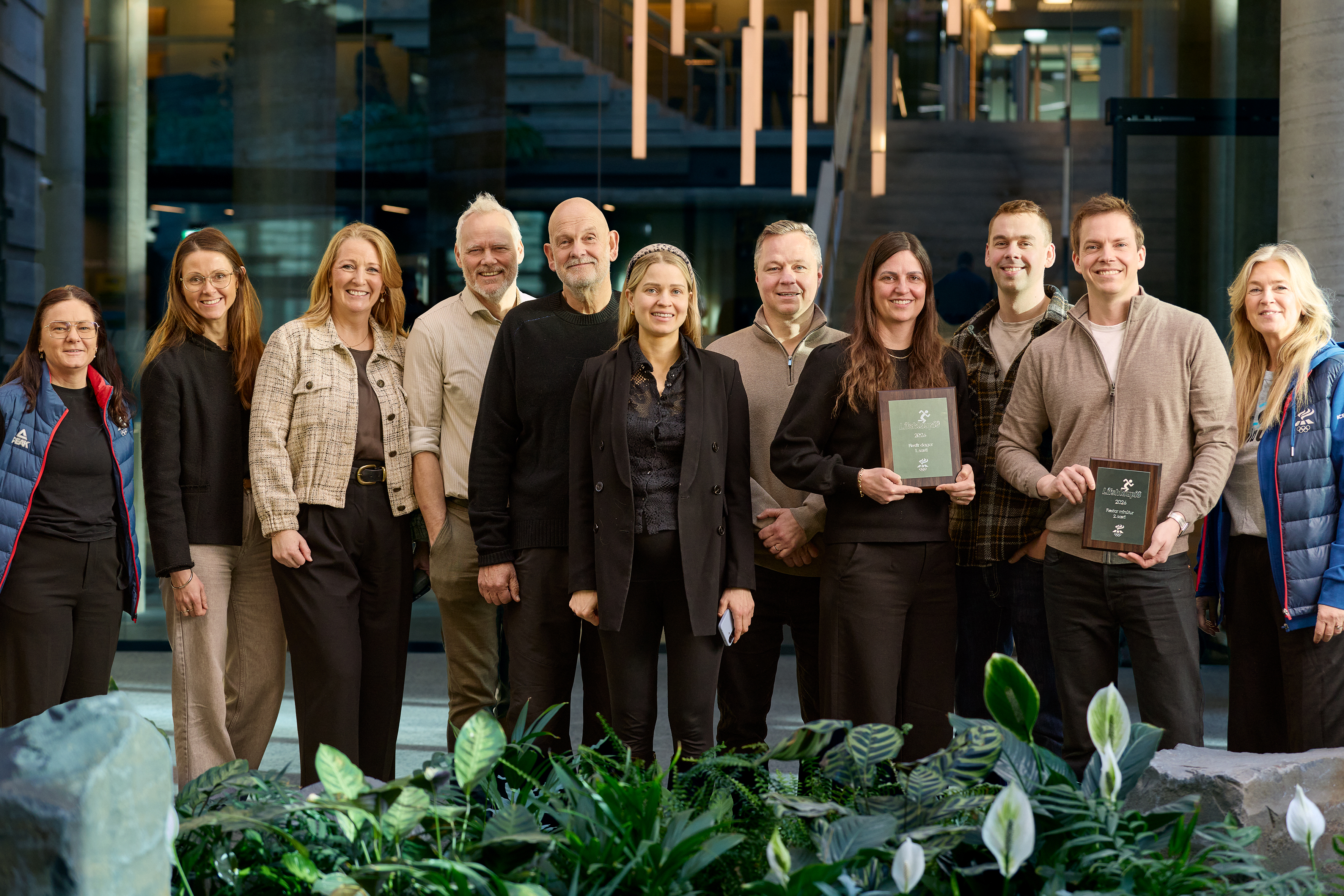 Nokkur fyrirtæki í Reykjavík voru ekki viðstödd verðlaunaafhendingu og fengu afhenta verðlaunaplatta frá Lindu Laufdal og Hansínu Þóru Gunnarsdóttur, sérfræðingum á fræðslu- og almenningsíþróttasviði ÍSÍ. Þær afhentu Landsbankanum, Vínbúðinni-ÁTVR, Heilsugæslu höfuðborgarsvæðisins og Gló stuðningsfélagi sína platta.Mynd nr. 1. sýnir hluta úr topp þremur liðum Landsbankanns saman með Lilju B. Einarsdóttir, bankastjóra, Söndru Hinriksstjóra, mannauðssviði og starfsmönnum ÍSÍ. Á mynd nr. 2 má sjá Jöhönnu Fríðu Dalkvist taka við platta fyrir hönd Vínbúðarinnar - ÁTVR. Á mynd nr. 3, má sjá Pálínu Ásbjörnsdóttir taka við plöttum fyrir hönd Heilsugæslu höfuðborgarsvæðisins og á mynd 4 má sjá starfsfólk Gló stuðningsfélags taka við plattanum sínum.